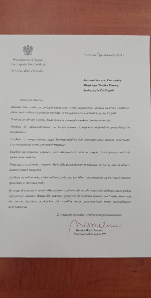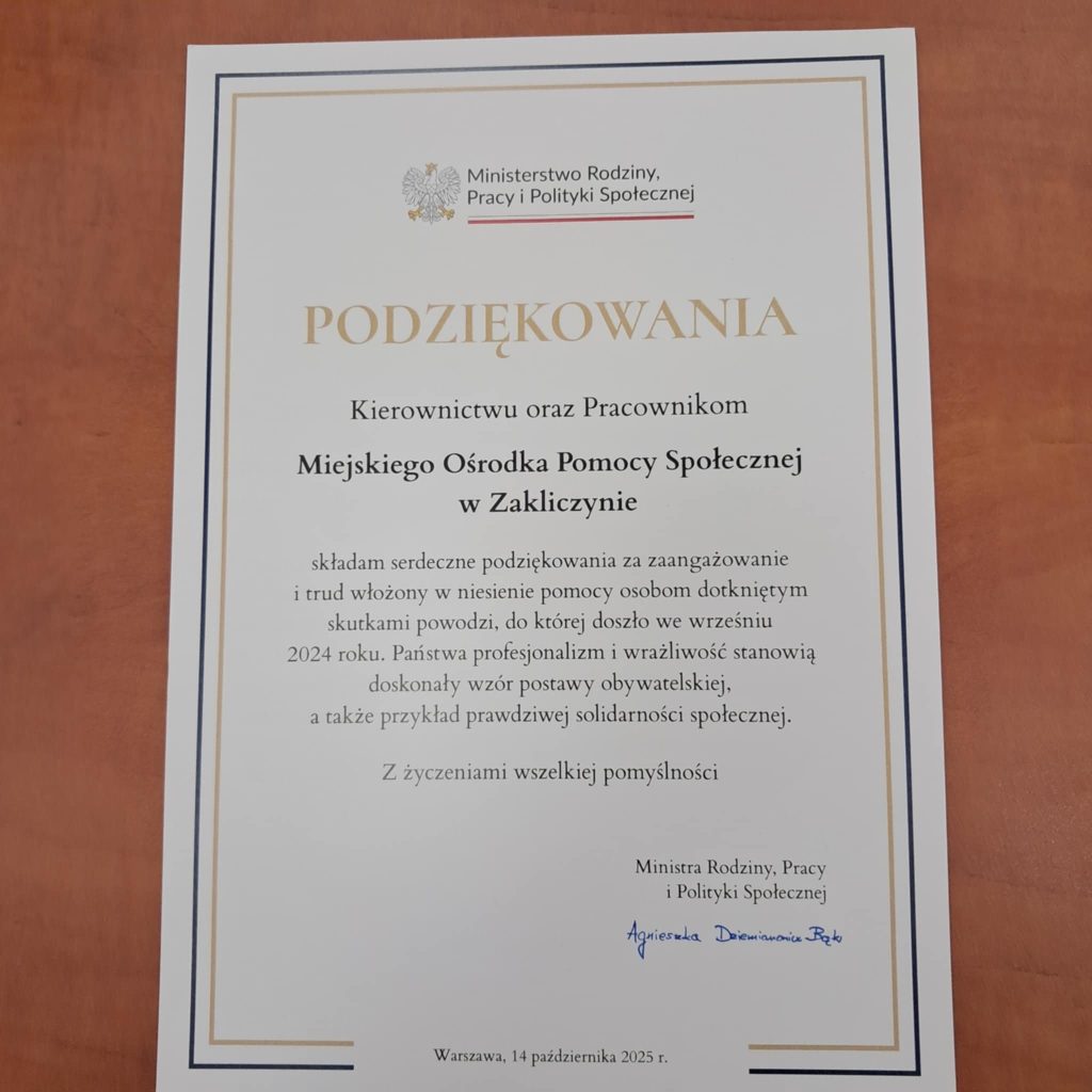 Na ręce Kierownictwa i Pracowników Miejskiego Ośrodka Pomocy Społecznej w Zakliczynie wpłynęły podziękowania ze strony Minister Rodziny, Pracy i Polityki Społecznej Pani Agnieszki Dziemianowicz – Bąk oraz Wicemarszałek Sejmu Rzeczypospolitej Pani Moniki Wielichowskiej za pracę i postawę, jakimi wykazali się pracownicy socjalni tutejszego Ośrodka, którzy zostali oddelegowani w marcu 2025 roku do pomocy osobom poszkodowanym podczas powodzi w 2024 roku.